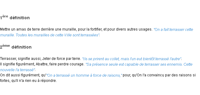 Ancienne signification parue en 17962 dans dictionnaire de l’Académie Française.Merci à Gratien et Philippine pour la numérisation du mot terrasser.