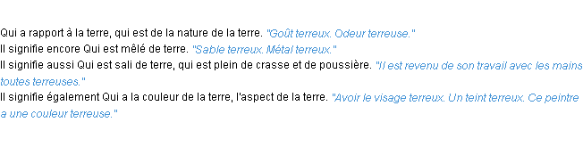 Signification parue en 2009 (source la-definition.fr).Merci à Mignon et Chloé pour la numérisation du mot terreux.