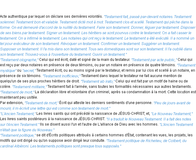 Ancienne signification éditée en 1835 pour le terme « testament » par l’Académie Française.