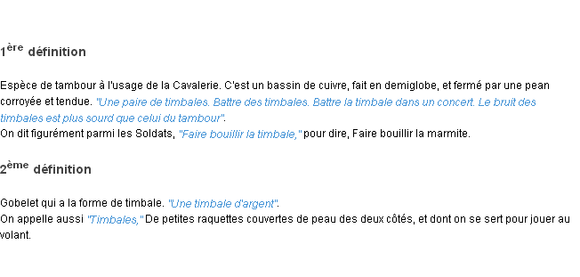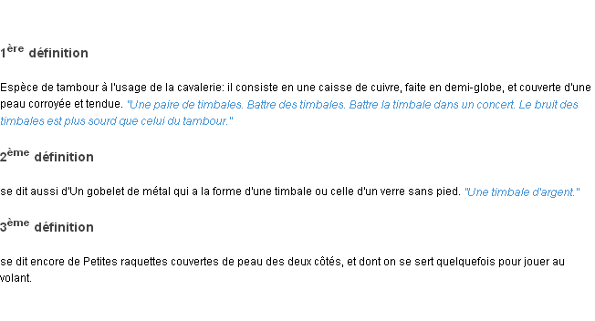 Définition du mot « timbale » par l’équipe de la-definition.fr (édition de 2011).Merci à éloise et émile pour la numérisation du mot timbale.