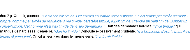 Signification parue en 2009 (source la-definition.fr).Merci à Baudouin et Irène pour la numérisation du mot timide.