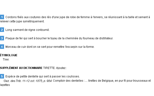 Définition d’Emile Littré (édition de 1876) pour le mot « tirette ».