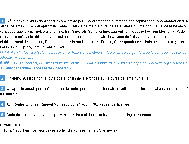 Signification du terme « tontine », parution de 1876 (dictionnaire le Littré).Merci à Olivie et Madeline pour la numérisation du mot tontine.