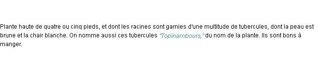 Définition de « topinambour » issue du Littré (Auteur Emile Littré, édité en 1876).Merci à Rémy et Célestine pour la numérisation du mot topinambour.