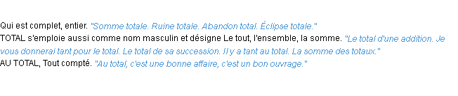Signification éditée en 2010 par l’équipe de la-definition.fr.Merci à Rémi et Philibert pour la numérisation du mot total.
