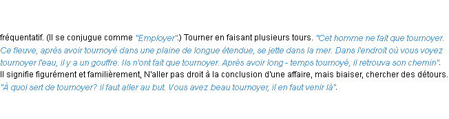 Signification éditée en 2010 par l’équipe de la-definition.fr.Merci à Florette et Armelle pour la numérisation du mot tournoyer.