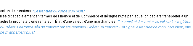 Définition issue du dictionnaire wiktionary pour le mot « transfert ».Merci à Patrice et Gervais pour la numérisation du mot transfert.