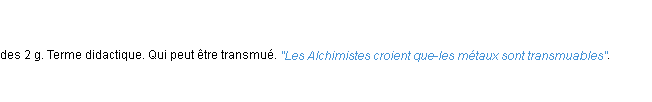 Définition d’Emile Littré (édition de 1876) pour le mot « transmuable ».Merci à Claudine et Désirée pour la numérisation du mot transmuable.