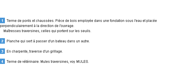 Signification du terme « traversine », parution de 1876 (dictionnaire le Littré).Merci à Laurentine et Jacques pour la numérisation du mot traversine.