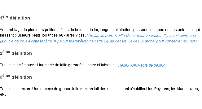 Définition du mot « treillis » par l’équipe de la-definition.fr (édition de 2011).Merci à Benoit et Basile pour la numérisation du mot treillis.