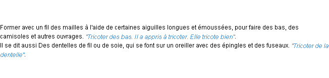Définition du mot « tricoter » par l’équipe de la-definition.fr (édition de 2011).Merci à Honoré et Mariette pour la numérisation du mot tricoter.