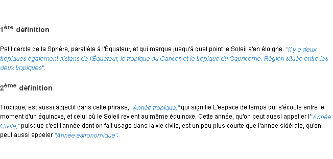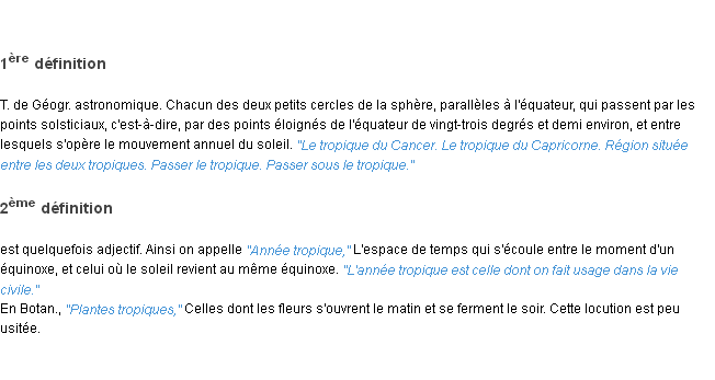 Définition de l’équipe de la-definition.fr (édition de 2009) pour le mot « tropique ».Merci à Nathalie et Laure pour la numérisation du mot tropique.