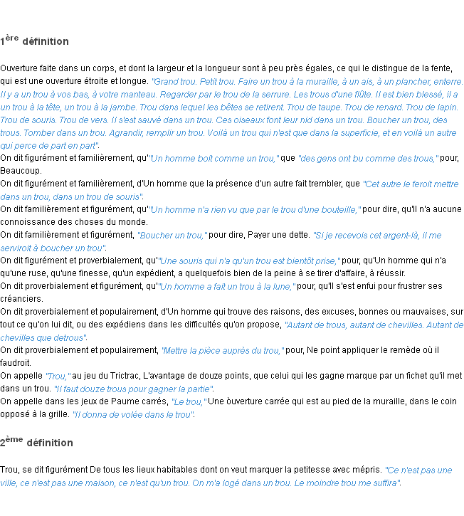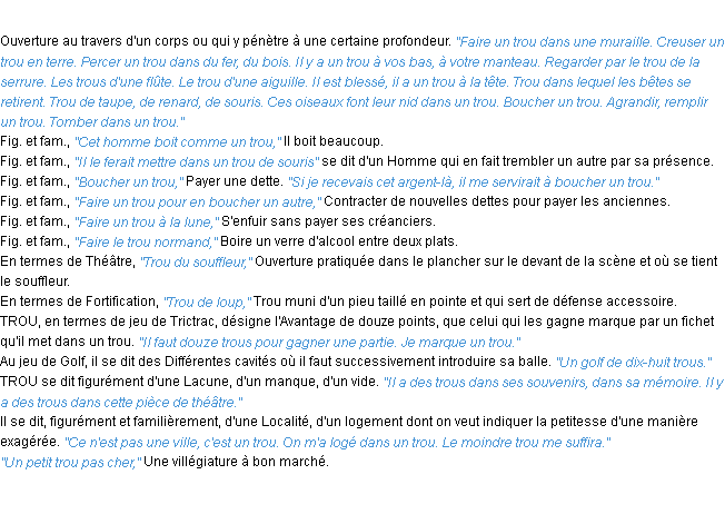 Définition « trou » du dictionnaire académique Français, parution de l’année 1932.