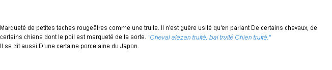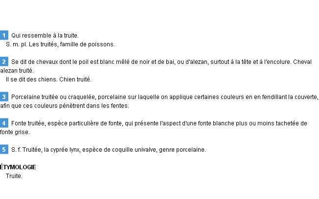 Signification du terme « truite », parution de 1876 (dictionnaire le Littré).Merci à Sébastien et Papillion pour la numérisation du mot truite.