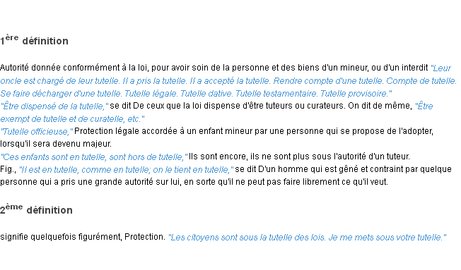 Définition du mot « tutelle » par l’équipe de la-definition.fr (édition de 2011).Merci à Madeline et Bénédicte pour la numérisation du mot tutelle.