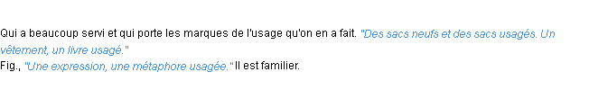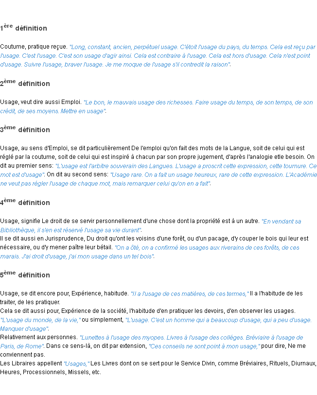 Définition du mot « usage » par l’équipe de la-definition.fr (édition de 2011).Merci à Joelle et Léon pour la numérisation du mot usage.