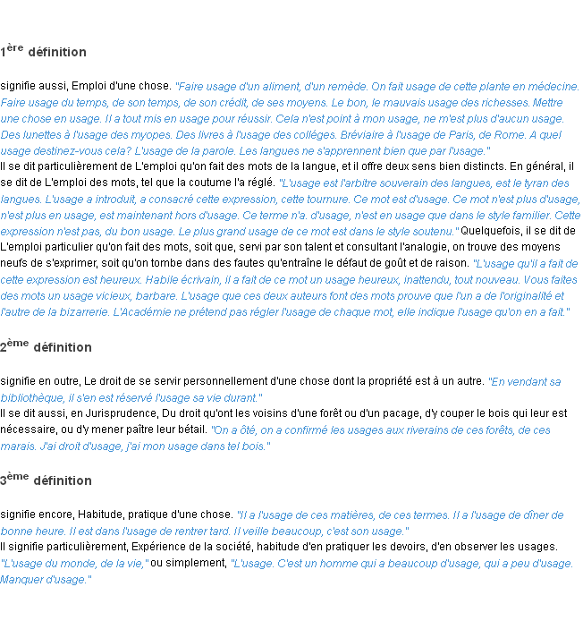 Ancienne définition académique pour le terme « usage » (parue en 1835).