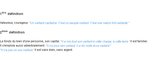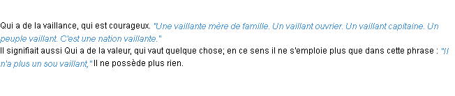 Signification parue en 2009 (source la-definition.fr).Merci à Paschal et Carole pour la numérisation du mot vaillant.