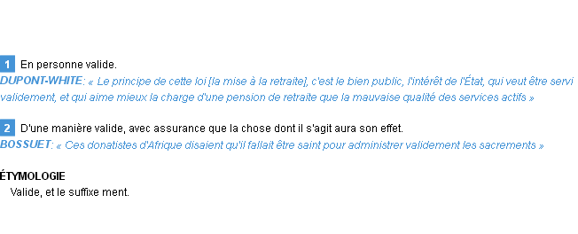 Définition d’Emile Littré (édition de 1876) pour le mot « validement ».Merci à Yolande et Yolande pour la numérisation du mot validement.