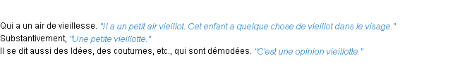 Définition de l’équipe de la-definition.fr (édition de 2009) pour le mot « vieillot ».Merci à Mathieu et Eléonore pour la numérisation du mot vieillot.