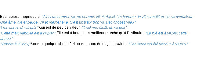 Signification parue en 2009 (source la-definition.fr).Merci à Noella et Sylvianne pour la numérisation du mot vil.