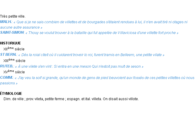 Définition de « villette » issue du Littré (Auteur Emile Littré, édité en 1876).