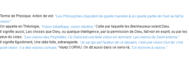 Ancienne signification parue en 17962 dans dictionnaire de l’Académie Française.Merci à Théo et Joël pour la numérisation du mot vision.