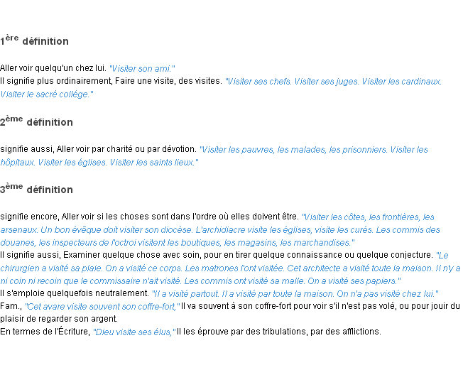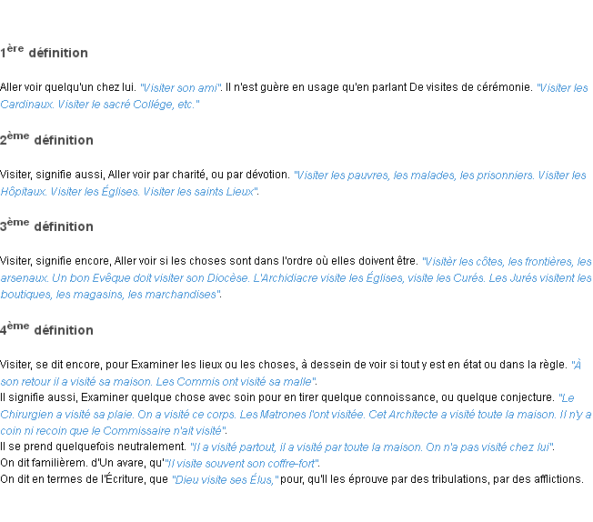 Définition du mot « visiter » par l’équipe de la-definition.fr (édition de 2011).Merci à Claudine et Régis pour la numérisation du mot visiter.