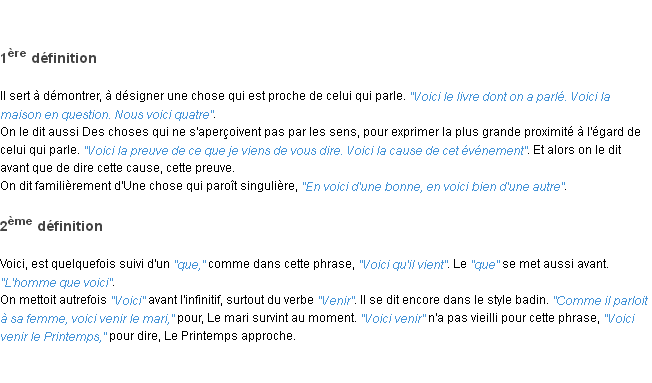 Définition du mot « voici » par l’équipe de la-definition.fr (édition de 2011).Merci à Aristide et Antoine pour la numérisation du mot voici.