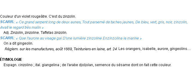 Signification du terme « zinzolin », parution de 1876 (dictionnaire le Littré).Merci à Fabrice et Mireille pour la numérisation du mot zinzolin.